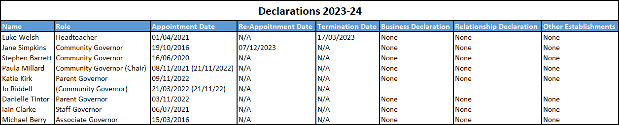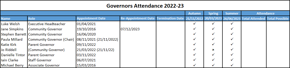 We meet together, each term, as the Academy Standards Committee (ASC) (Governing Body), to discuss various aspects of the school’s management and organisation. From time to time, the ASC also establishes working groups to review and develop specific aspects of school policy. Each Governor undertakes a specific area of responsibility related to a particular area of interest such as safeguarding, SEND, curriculum, pupil progress, attendance etc.
