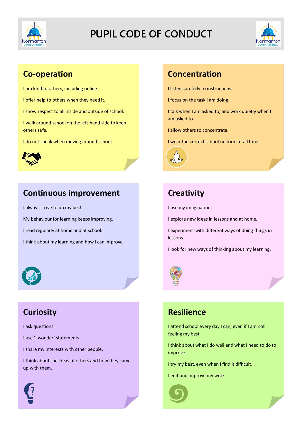 Pupils of the Pupil Leadership Team, supported by the Senior Leadership Team, formulated the Pupil Code of Conduct detailing the Normanton Junior Academy’s ‘norms’.