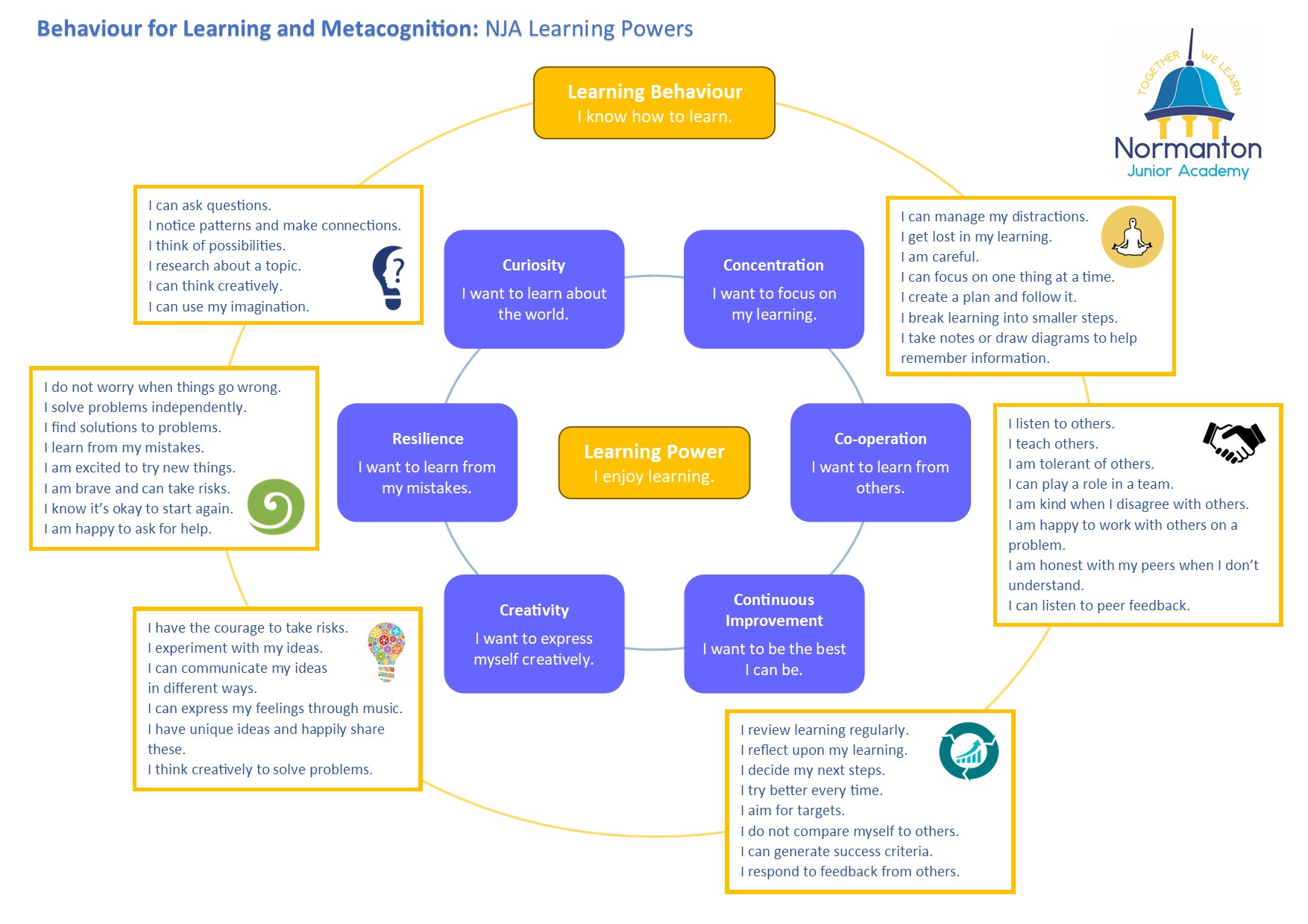 At Normanton Junior Academy, all learning experiences are underpinned by six learning powers that constitute our values:
